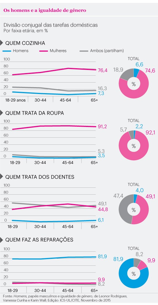 A socióloga Karin Wall, coordenadora do estudo, aponta alguns sinais de mudança – pelo menos nos casais mais jovens. Acrescenta que “a cozinha é a dimensão da vida doméstica onde os homens marcam presença de forma crescente, quer dividindo tarefas, quer chamando a si a responsabilidade”, explicando que nos casais mais jovens o homem cozinha cerca de o dobro, em relação ao total de casais.